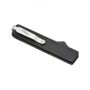 Caractéristiques techniques Lame Acier : D2 Longueur : 80 mm Épaisseur : 3 mm Ouverture : Automatique OTF double action Manche Matériau : Aluminium anodisé Insert : Fibre de carbone (un côté) Couleur : Noir Longueur : 115 mm Largeur : 22 mm Épaisseur : 12 m Dimensions générales Longueur totale : 194 mm Clip de poche : Acier, numéro de série gravé